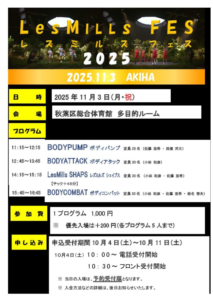 11月3日(月・祝)に多目的ルームで開催する『LesMills FES 2025』のプログラム及びスケジュール、インストラクターが発表になりました!! 申込受付は、10月4日(土)スタートです!(10月11日(土)まで) […]