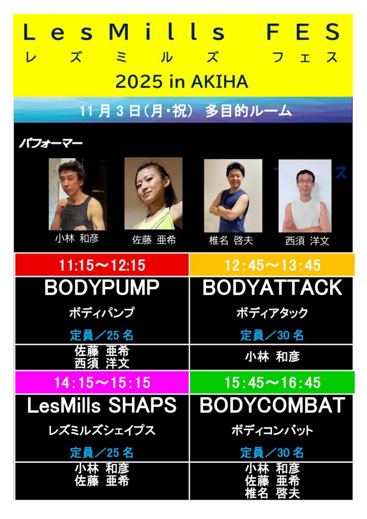 日頃より秋葉区総合体育館をご利用いただきまして、ありがとうございます。 11月3日(月・祝)に『LesMills FES 2025』というイベントを開催することになりました。 文化の日の一日、人気のLesMillsプログ […]